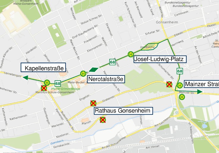 Die Haltestelle Rathaus Gonsenheim entfällt. An den Haltestellen Mainzer Straße und Kapellenstraße hält die Linie 68 in dieser Richtung an anderen Orten