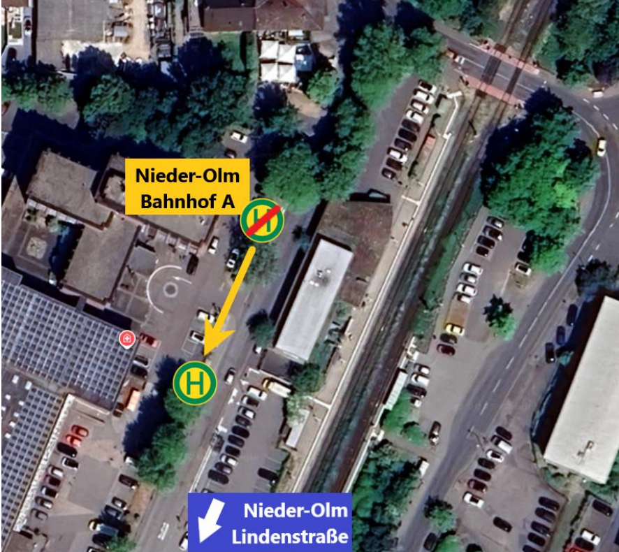 Von Freitag, 28.11.2025 bis Freitag, 05.12.2025 ist die Haltestelle Nieder-Olm/Bahnhof A wegen Bauarbeiten gesperrt.
