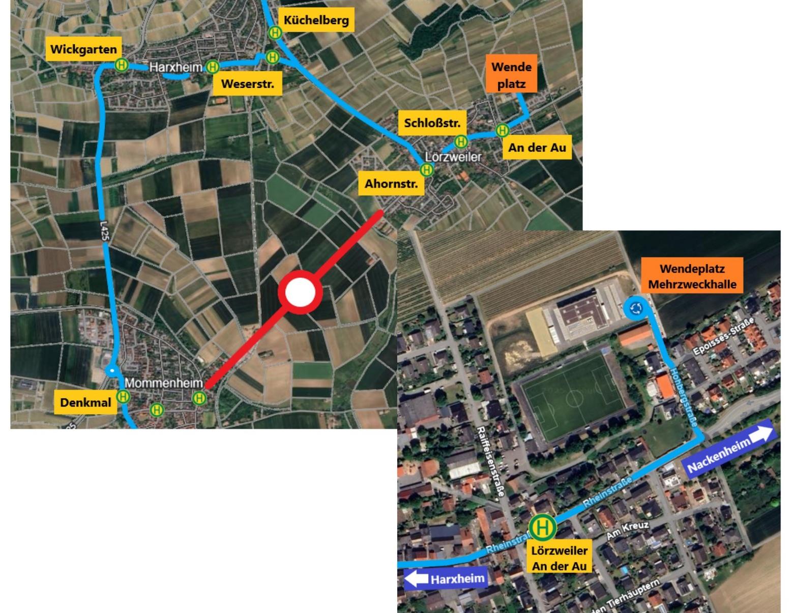 Aufgrund der Sperrung der Verbindungsstraße zwischen Lörzweiler und Mommenheim können auch die Haltestellen Bahnhofstraße, Hindenburgstraße und Denkmal in Mommenheim während der Bauzeit teilweise nicht bedient werden.