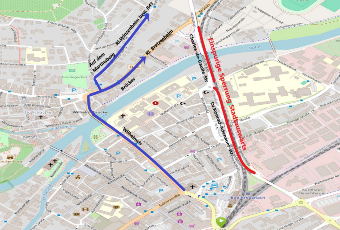 Die betroffenen Fahrten Richtung Winzenheim oder zur ADS: fahren die Umleitung über Wilhemstraße - Auf dem Martinsberg - Winzenheimerstraße weiter Richtung Winzenheim bzw. Richtung B41.