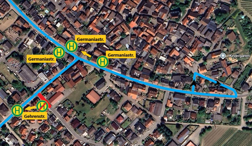- In Richtung Bingen wird die Haltestelle Aspisheim/Germaniastraße in die Germaniastraße auf Höhe Hausnummer 20 verlegt